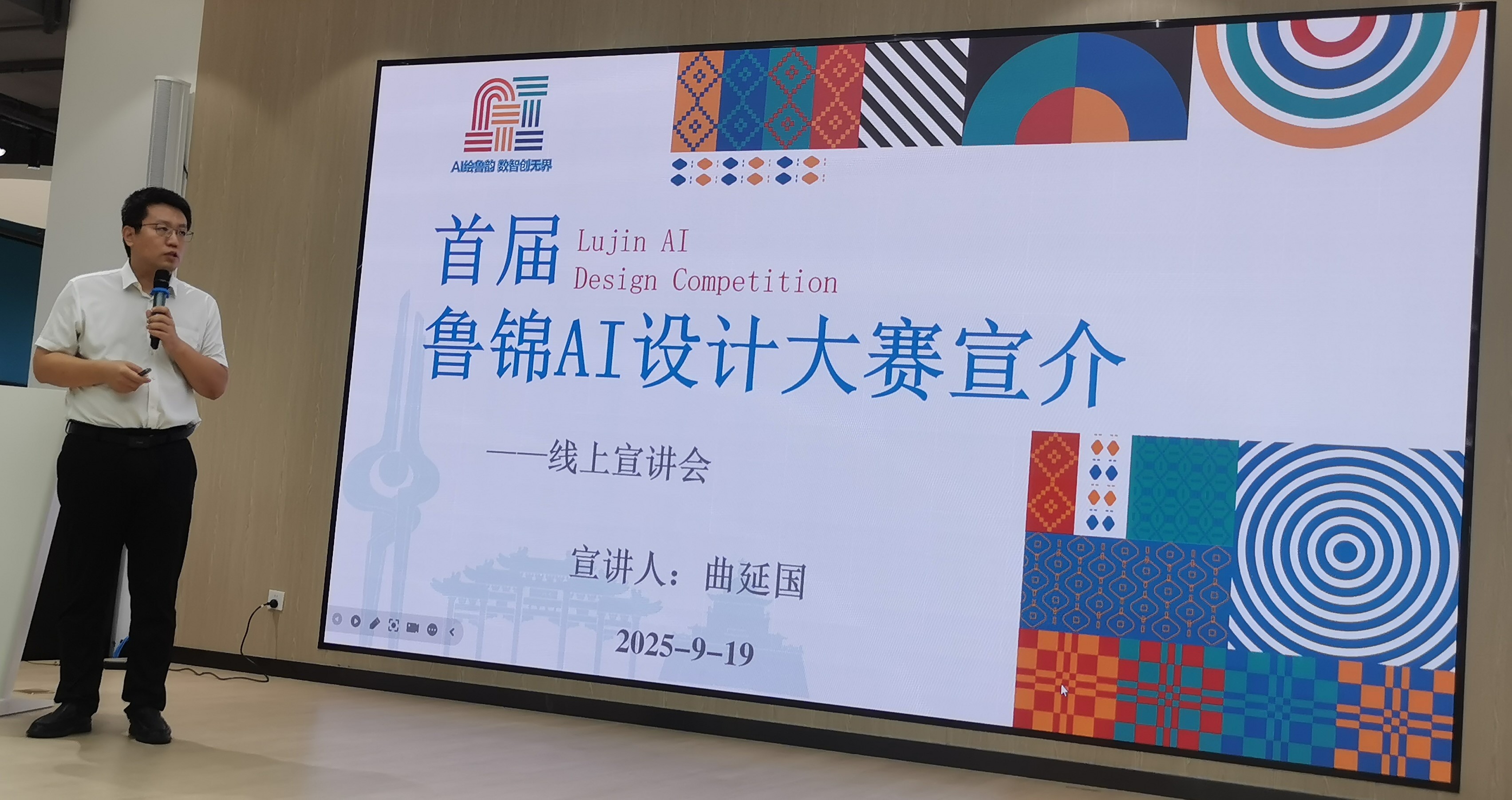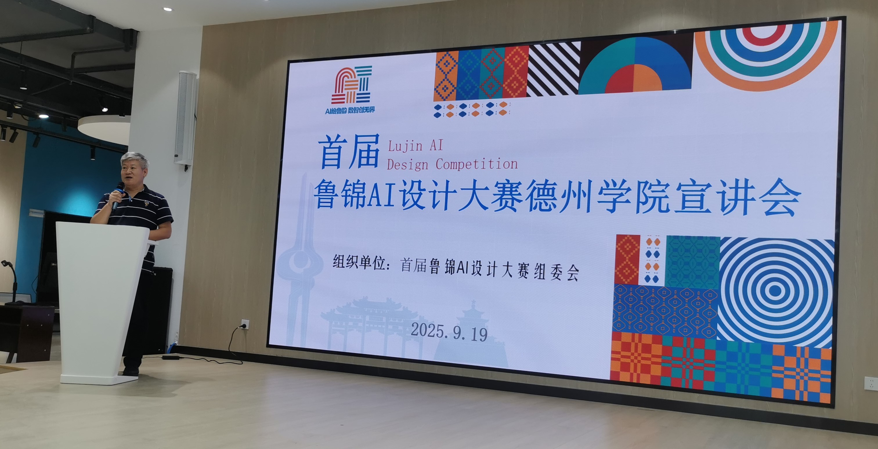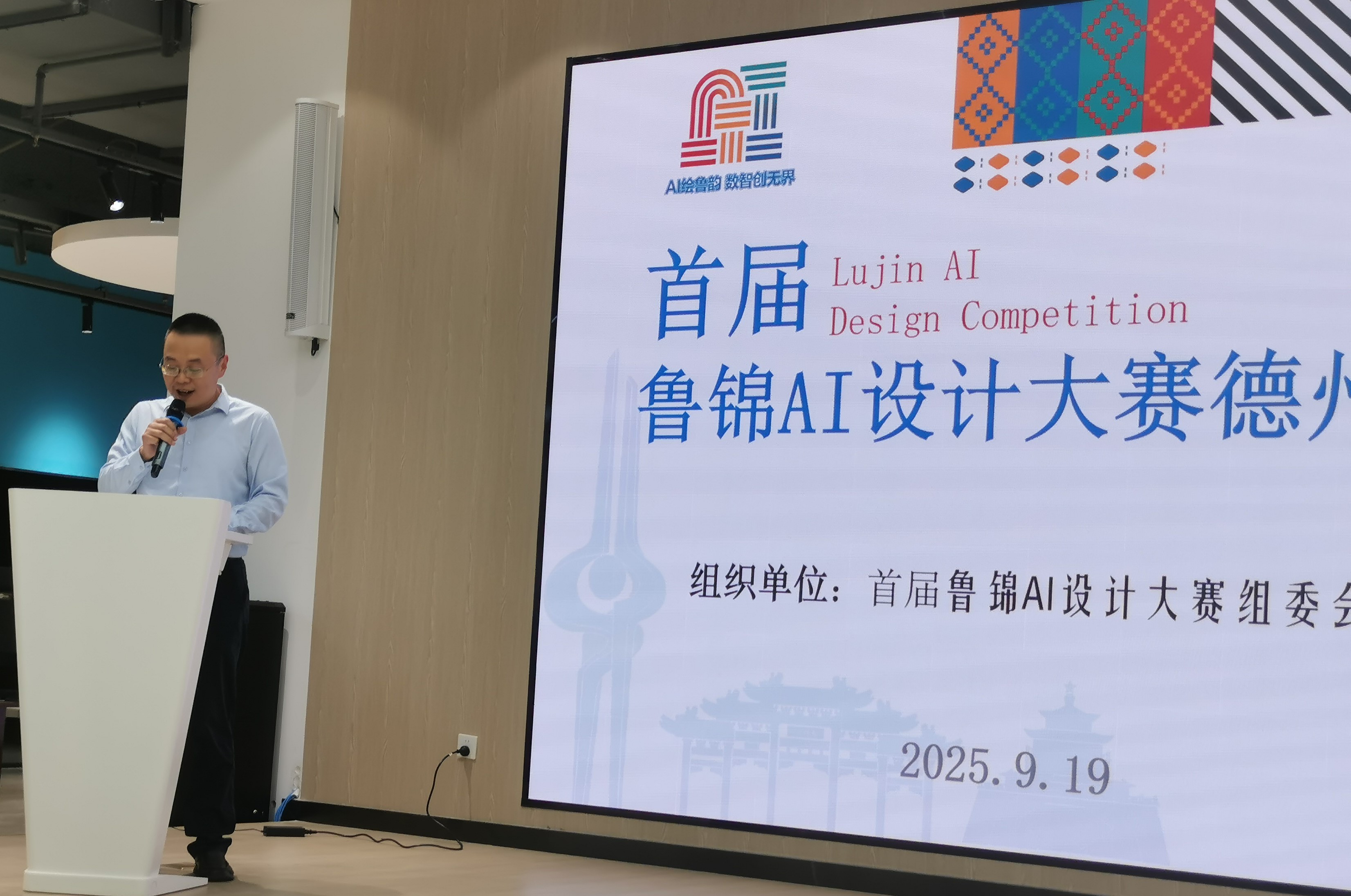 2025年9月19日下午,“首届鲁锦AI设计大赛”线下宣讲活动在德州学院大学生就业创业赋能中心隆重举行。德州学院相关专业200余名师生参加宣讲会。我司售前技术顾问卢胜书受邀出席,为现场师生开展“天工开物-AIGC技术应用能力提升”培训,示范“AI×鲁锦”设计全流程,让鲁锦在AI加持下焕发全新数字生命力。