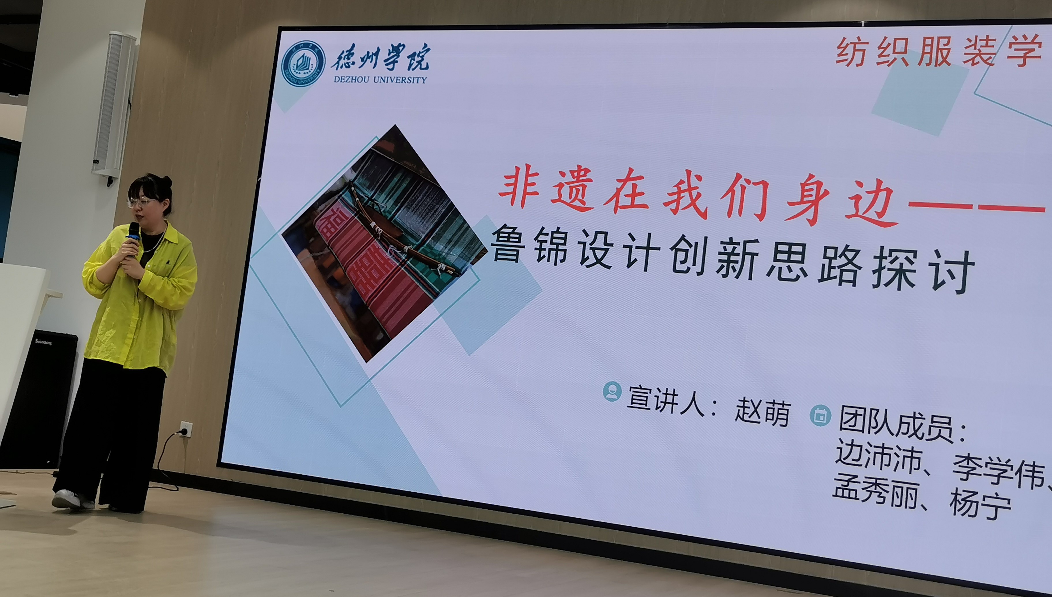 随后,由山东纺织工程学会副秘书长曲延国代表大赛组委会详细介绍大赛赛程安排、参赛要求及奖项政策等。德州学院纺织服装学院赵萌副教授做《非遗在我们身边——鲁锦设计创新思路探讨》专题分享,对鲁锦的历史渊源、纹样特色、色彩体系到现代设计转化路径进行专业解读,为参会师生提供了宝贵的创作灵感。