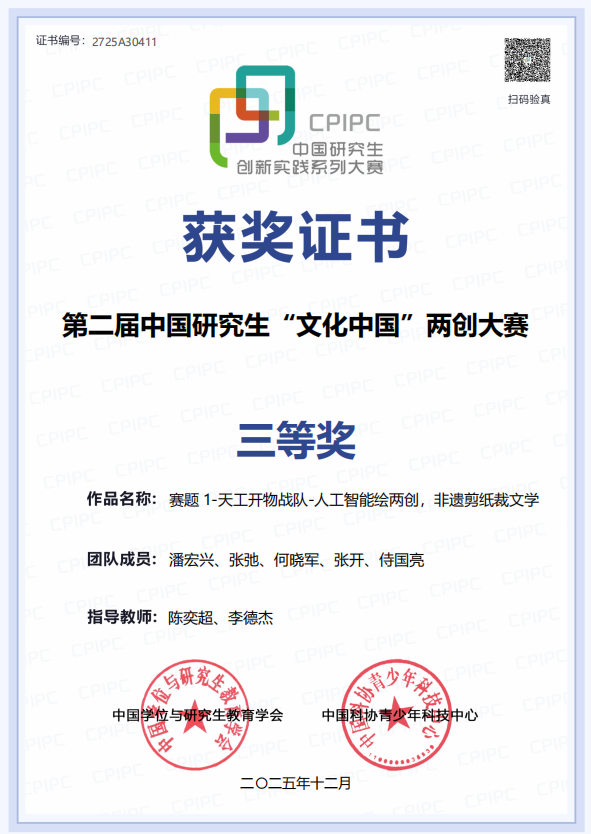 近日,第二届中国研究生“文化中国”两创大赛顺利完赛,由“天工开物”大模型提供技术支撑、上海交通大学电子信息与电气工程学院(学部)工程管理硕士组建团队参赛,带来“人工智能绘两创,非遗剪纸裁文学”项目,荣获全国三等奖。我司首席信息官李德杰在本次大赛中,担任企业导师。